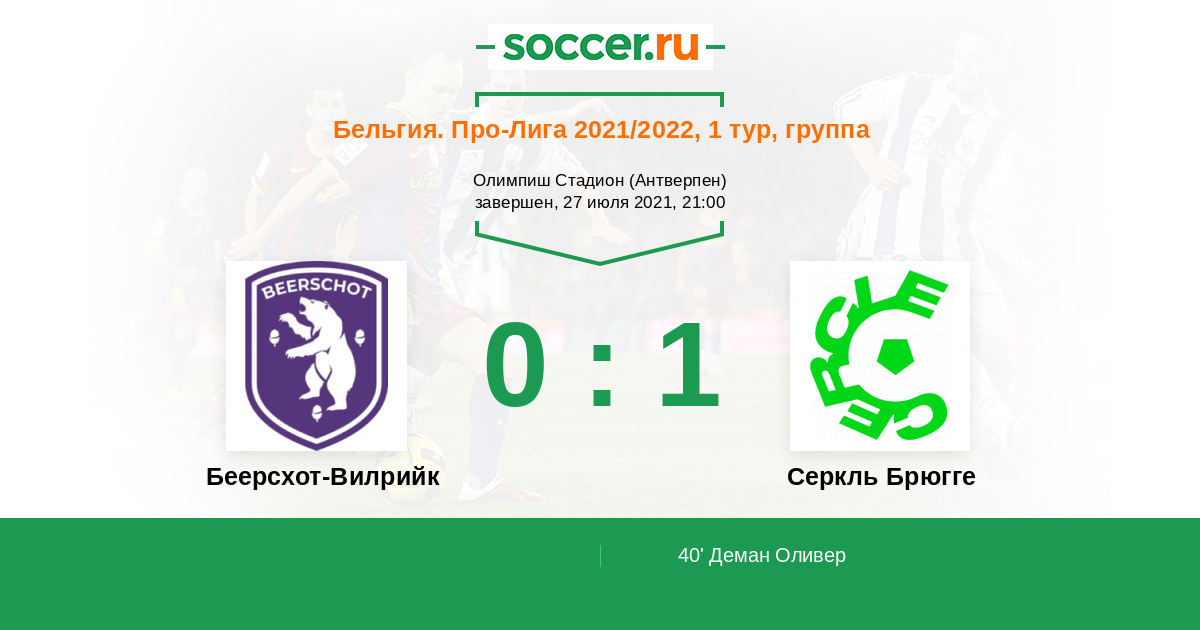 Бельгия. 1B Про Лига 10.09.2017 Серкль Брюгге Логотип футбольный клуб Серкль Брюгге 0:1 Логотип футбольный клуб Беерсхот-Вилрийк Беерсхот-Вилрийк