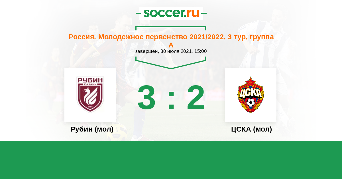 Россия. Премьер-Лига U21 07.07.2023 Рубин (мол) Логотип футбольный клуб Рубин (мол) (Казань) 2:3 Логотип футбольный клуб ЦСКА (мол) (Москва) ЦСКА (мол)