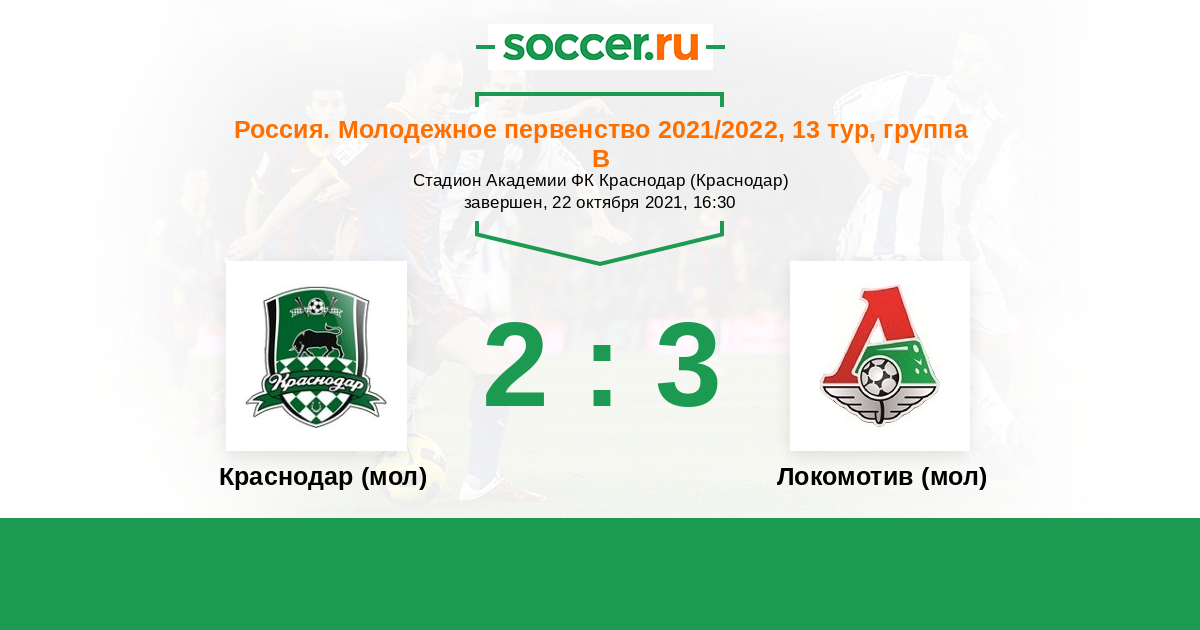 Россия. Премьер-Лига U21 23.07.2021 Локомотив (мол) Логотип футбольный клуб Локомотив (мол) (Москва) 3:0 Логотип футбольный клуб Краснодар (мол) Краснодар (мол)