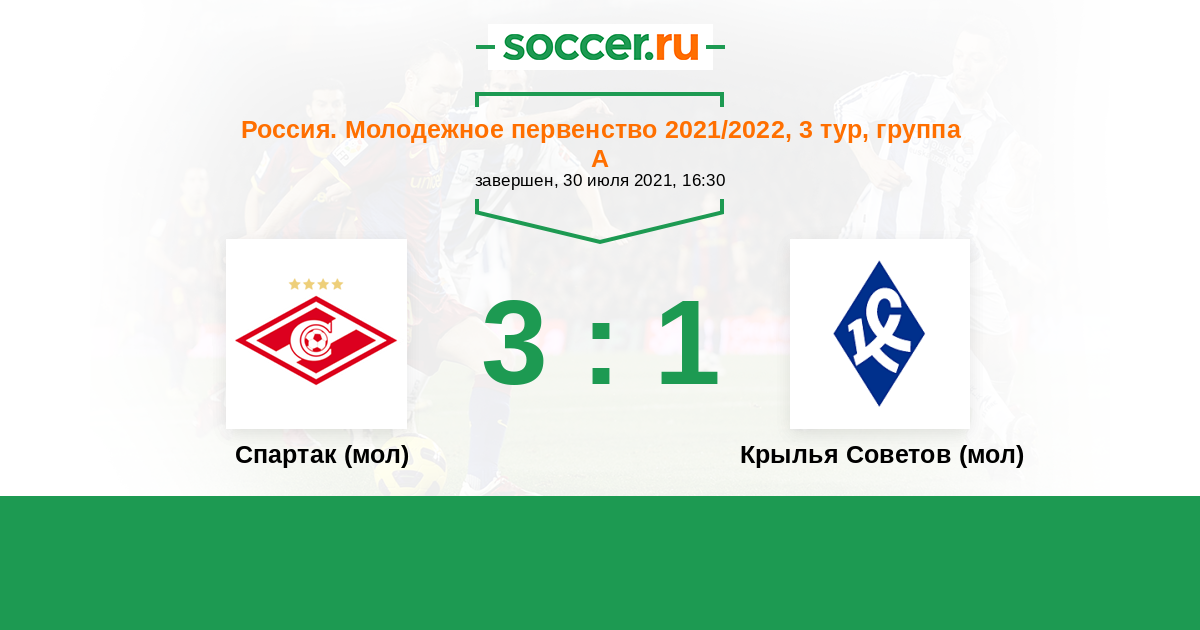 Россия. Премьер-Лига U21 24.07.2010 Крылья Советов (мол) Логотип футбольный клуб Крылья Советов (мол) (Самара) 1:1 Логотип футбольный клуб Спартак (мол) (Москва) Спартак (мол)