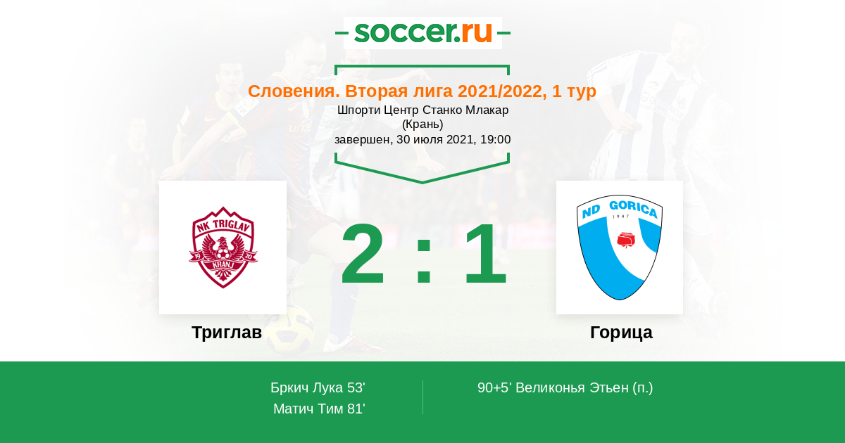 Словения. Первая Лига 30.07.2020 Триглав Логотип футбольный клуб Триглав (Крань) 0:5 Логотип футбольный клуб Горица (Ново-Горица) Горица