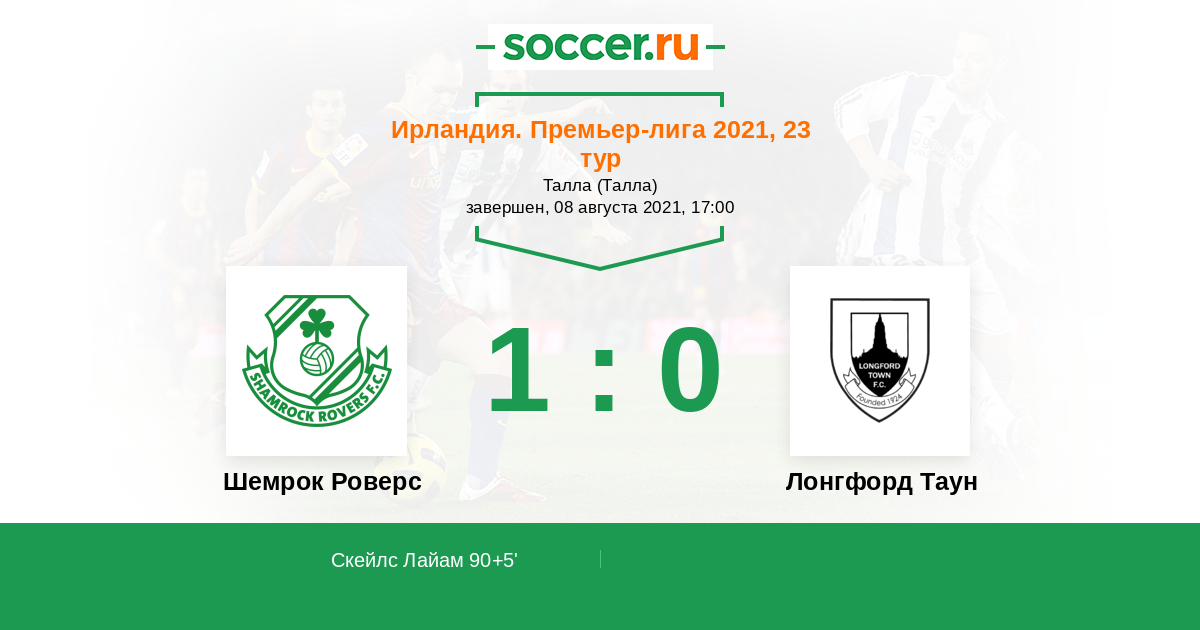 Ирландия. Премьер-лига 23.10.2021 Лонгфорд Таун Логотип футбольный клуб Лонгфорд Таун 0:1 Логотип футбольный клуб Шемрок Роверс (Дублин) Шемрок Роверс