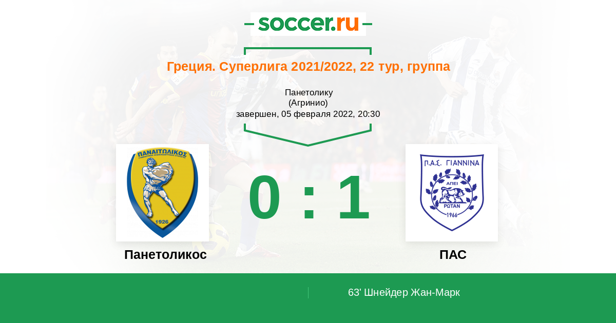 Греция. Суперлига 20.01.2023 Панетоликос Логотип футбольный клуб Панетоликос (Агринио) 1:1 Логотип футбольный клуб ПАС (Яннина) ПАС