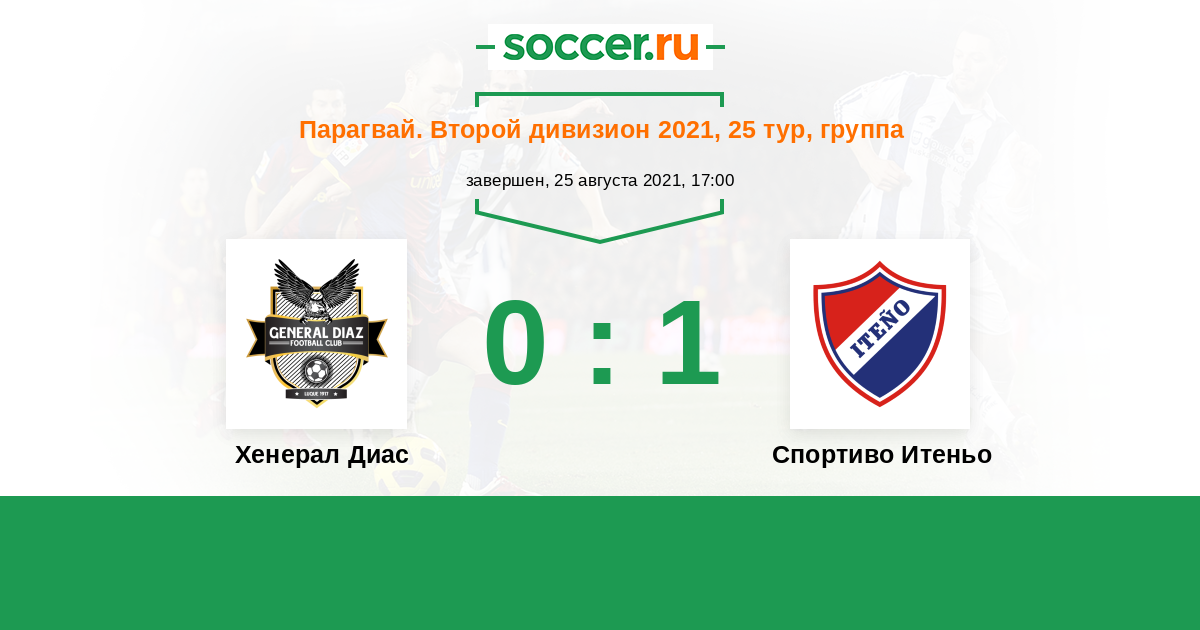 Парагвай. Второй дивизион 21.05.2021 Спортиво Итеньо Логотип футбольный клуб Спортиво Итеньо (Ита) 0:0 Логотип футбольный клуб Хенерал Диас (Луке) Хенерал Диас