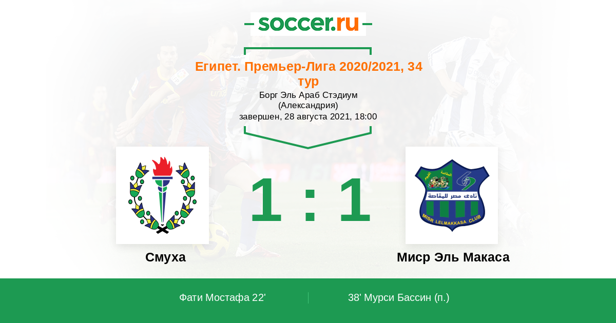 Египет. Премьер-Лига 25.04.2022 Смуха Логотип футбольный клуб Смуха (Александрия) 1:0 Логотип футбольный клуб Миср Эль Макаса (Фаюм) Миср Эль Макаса