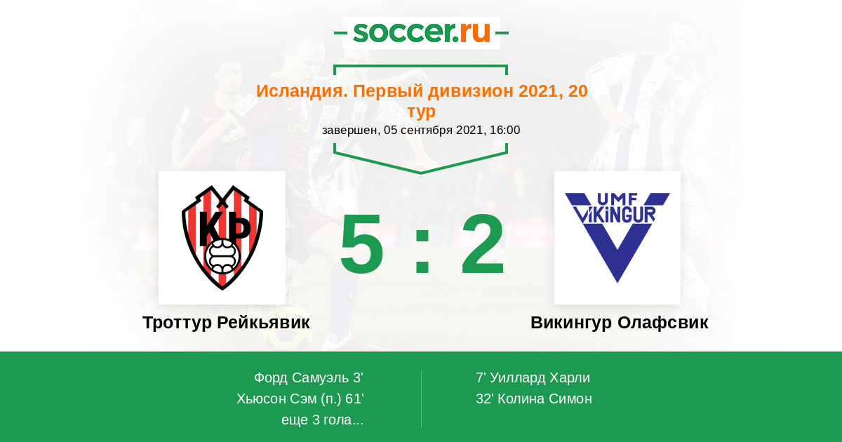 Исландия. Первый дивизион 01.07.2021 Викингур Олафсвик Логотип футбольный клуб Викингур Олафсвик 0:7 Логотип футбольный клуб Троттур Рейкьявик Троттур Рейкьявик