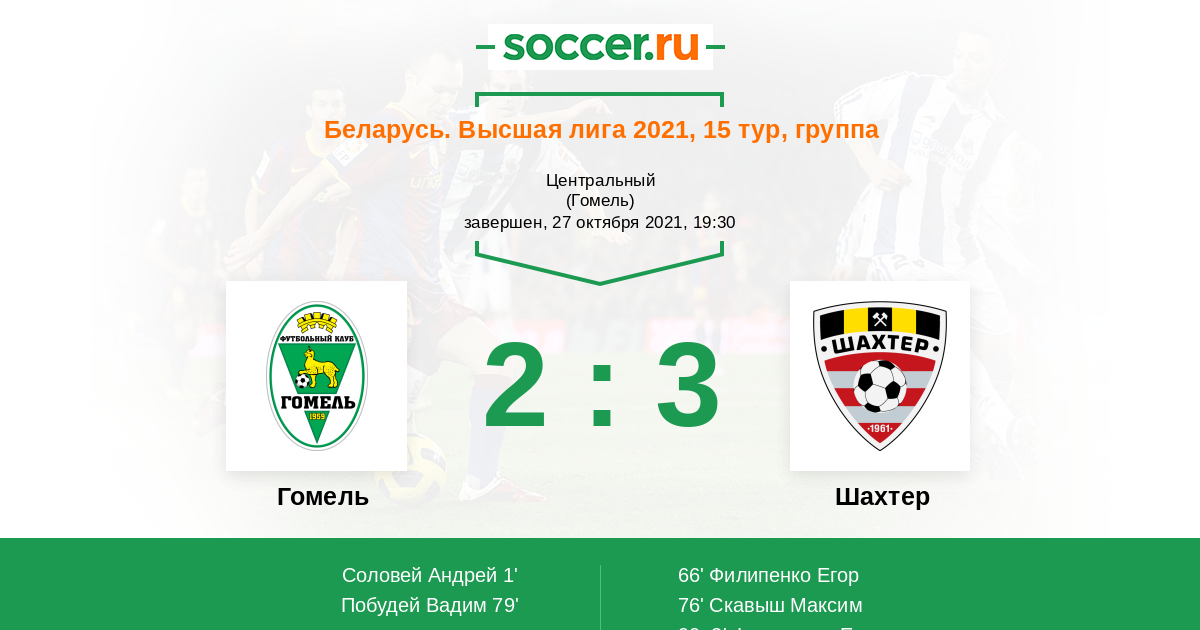 Беларусь. Высшая лига 28.11.2021 Шахтер Логотип футбольный клуб Шахтер (Солигорск) 0:1 Логотип футбольный клуб Гомель Гомель