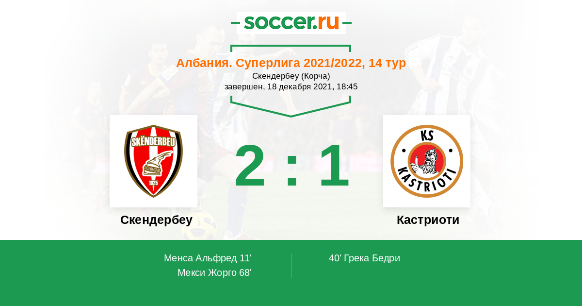 Албания. Суперлига 16.10.2021 Кастриоти Логотип футбольный клуб Кастриоти (Круже) 2:0 Логотип футбольный клуб Скендербеу (Корча) Скендербеу