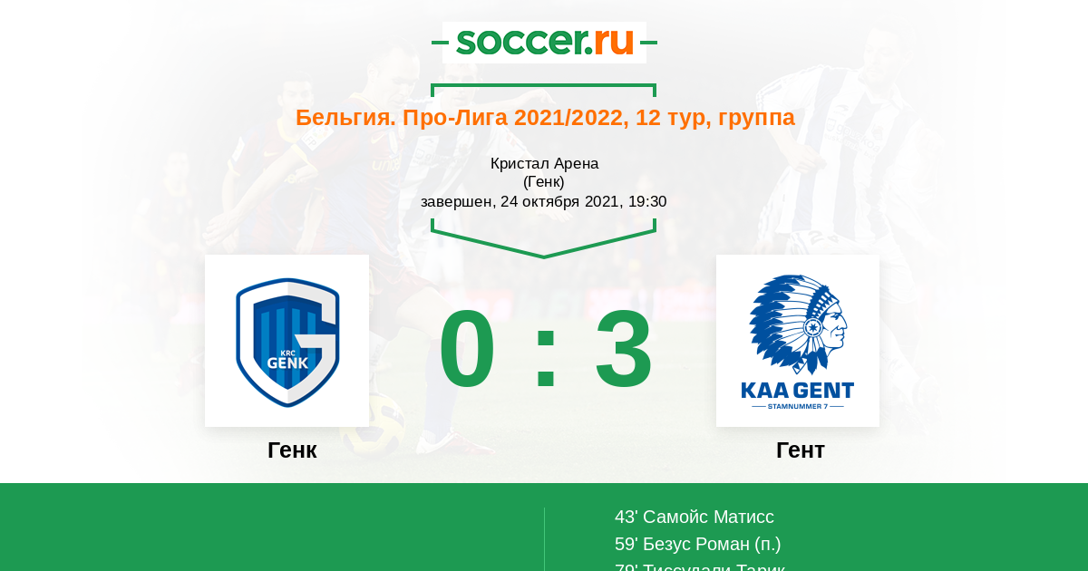 Бельгия. Про-Лига 12.12.2021 Гент Логотип футбольный клуб Гент 1:0 Логотип футбольный клуб Генк Генк