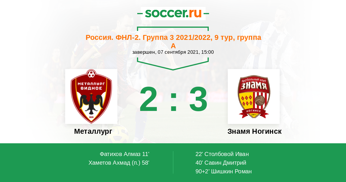 Россия. Вторая лига. Группа 3 31.10.2021 Знамя Ногинск Логотип футбольный клуб Знамя Ногинск 3:1 Логотип футбольный клуб Металлург (Видное) Металлург