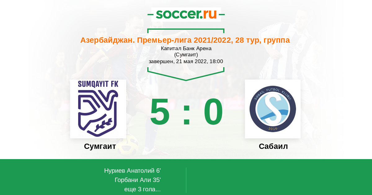Азербайджан. Премьер-Лига 19.05.2021 Сабаил Логотип футбольный клуб Сабаил (Баку) 0:1 Логотип футбольный клуб Сумгаит Сумгаит