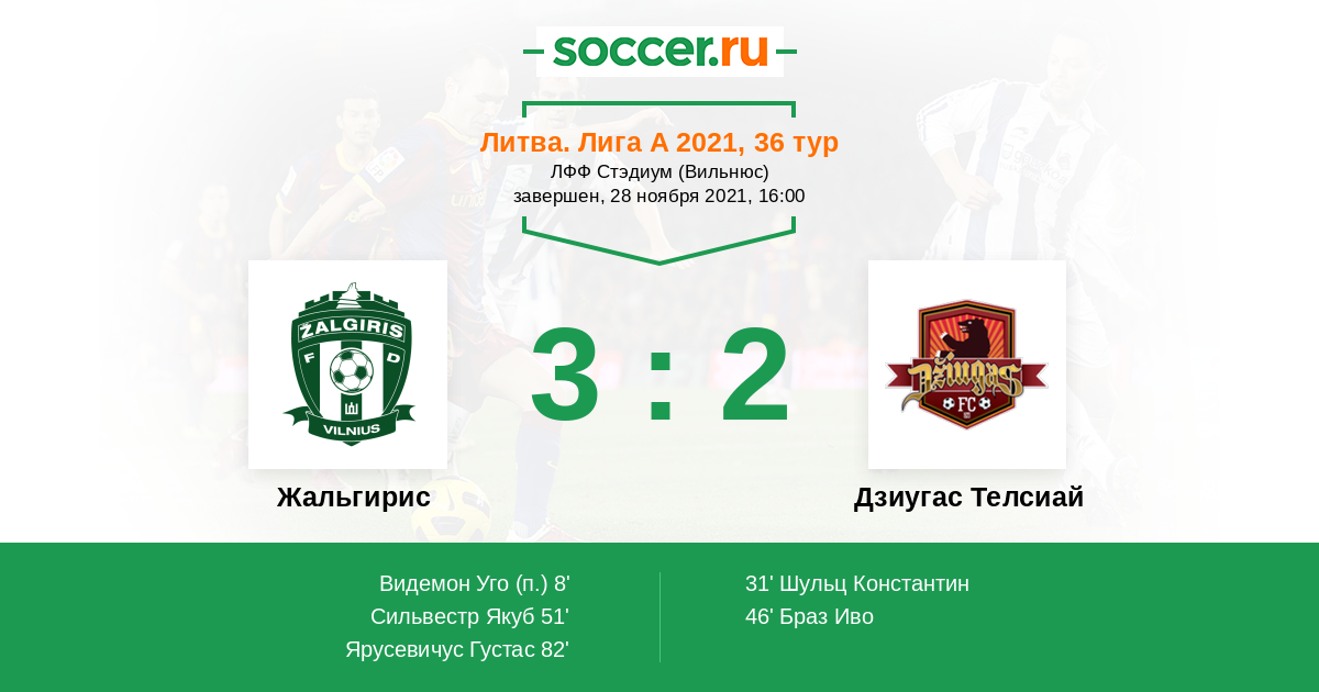 Литва. Лига А 20.04.2021 Жальгирис Логотип футбольный клуб Жальгирис (Вильнюс) 2:2 Логотип футбольный клуб Дзиугас Телсиай (Тельшай) Дзиугас Телсиай