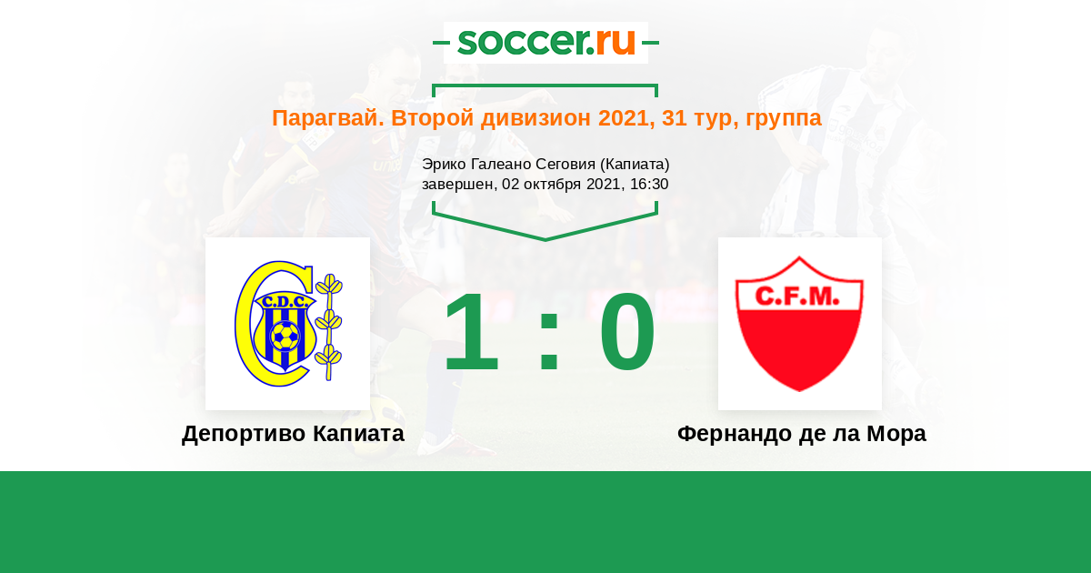 Парагвай. Второй дивизион 22.06.2021 Фернандо де ла Мора Логотип футбольный клуб Фернандо де ла Мора 1:0 Логотип футбольный клуб Депортиво Капиата Депортиво Капиата