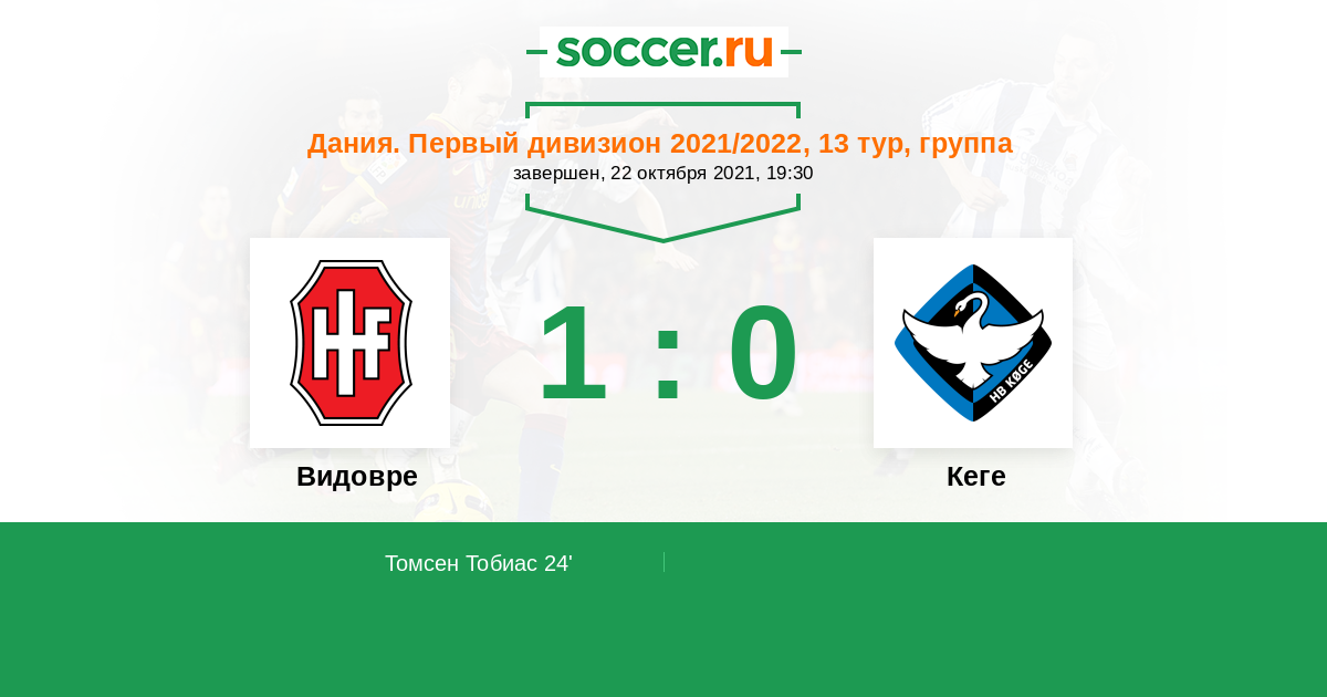 Дания. Первый дивизион 11.09.2020 Кеге Логотип футбольный клуб Кеге 2:1 Логотип футбольный клуб Видовре Видовре