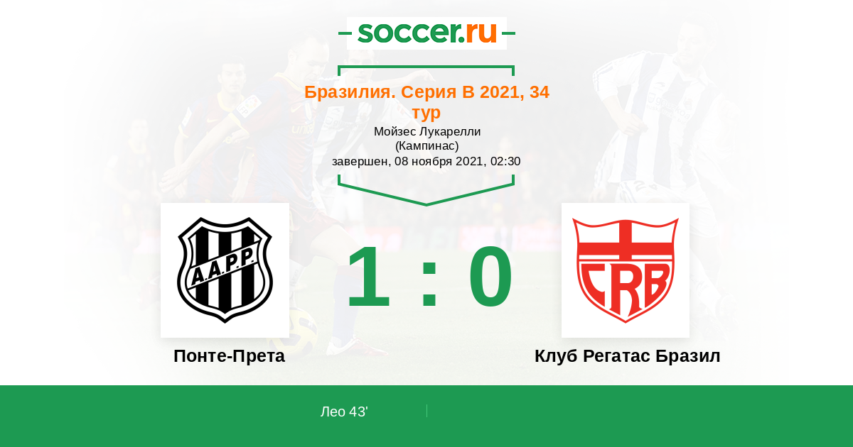 Бразилия. Серия В 24.10.2020 Клуб Регатас Бразил Логотип футбольный клуб Клуб Регатас Бразил (Масейо) 1:0 Логотип футбольный клуб Понте-Прета (Кампинас) Понте-Прета