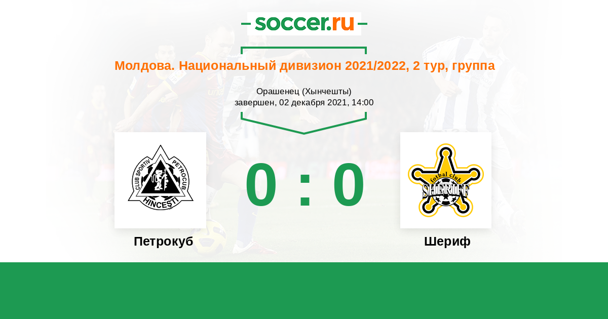 Молдова. Национальный дивизион 31.10.2021 Петрокуб Логотип футбольный клуб Петрокуб (Хынчешты) 0:2 Логотип футбольный клуб Шериф (Тирасполь) Шериф