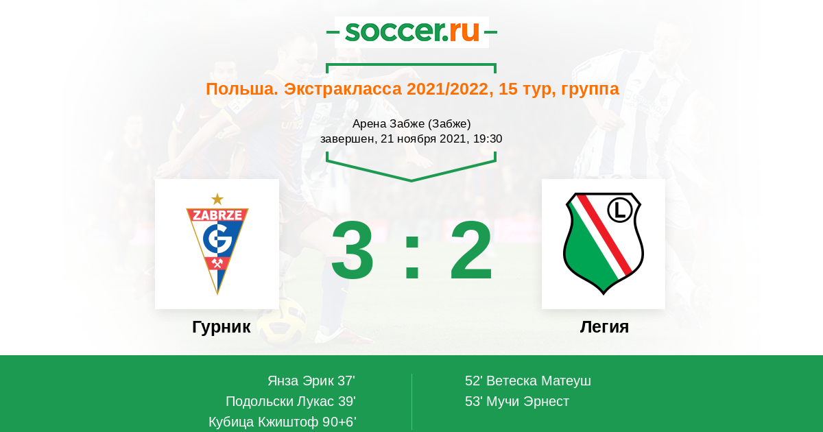 Польша. Экстракласса 06.05.2022 Легия Логотип футбольный клуб Легия (Варшава) 5:3 Логотип футбольный клуб Гурник (Забже) Гурник