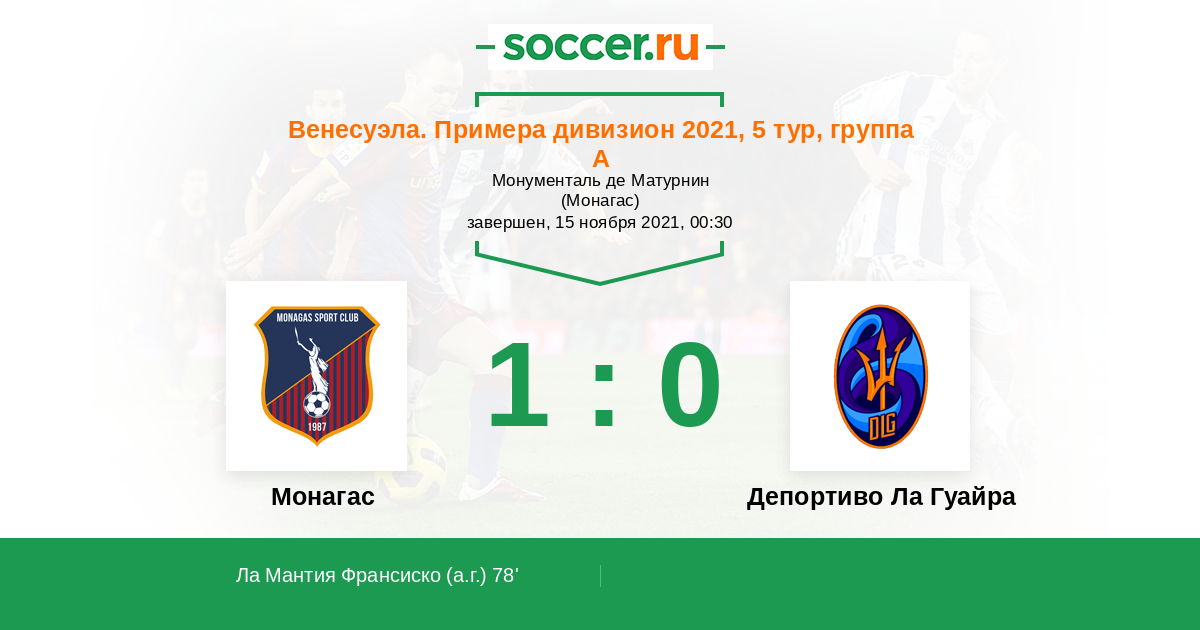 Венесуэла. Примера дивизион 06.12.2021 Депортиво Ла Гуайра Логотип футбольный клуб Депортиво Ла Гуайра (Каракас) 2:0 Логотип футбольный клуб Монагас (Матурин) Монагас