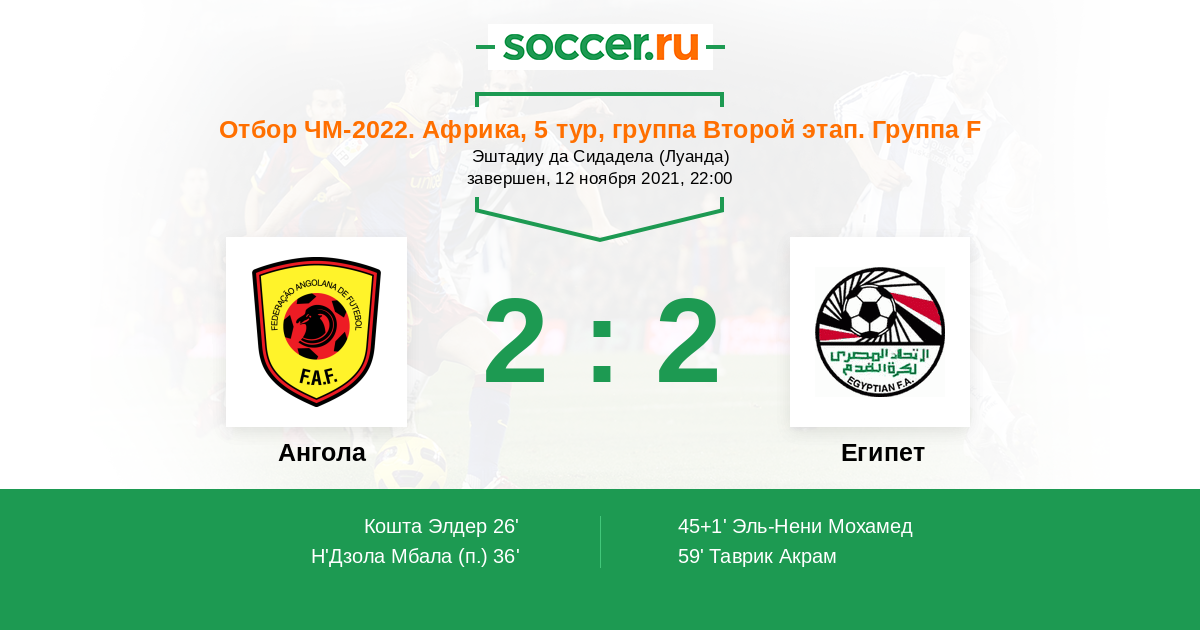 После четырёх матчей Ангола имеет лишь одну победу, которая была добыта в поединке третьего тура над Габоном (3-1). В остальных трёх играх были исключительно поражения, причём одно из них от всё того же Габона (0-2), а ещё от Египта в первом туре (0-1) и от Ливии во втором (0-1). С тремя очками сборная Анголы замыкает турнирную таблицу группы F, не имея шансов подняться на первую строчку, до которой семь баллов.