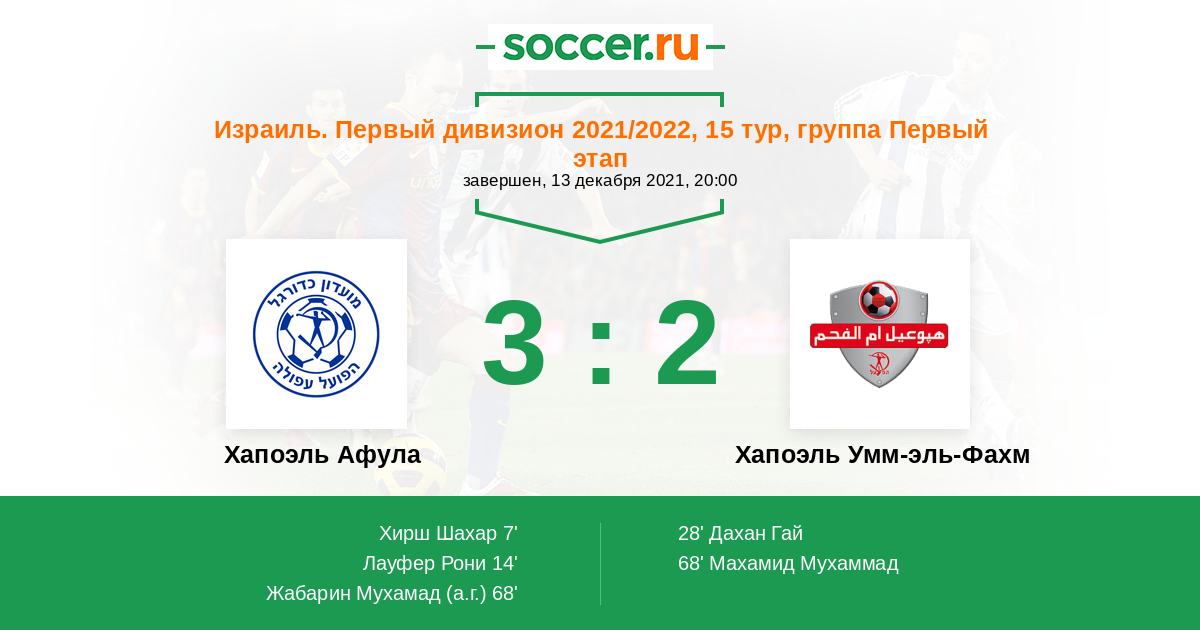 Израиль. Первый дивизион 18.03.2022 Хапоэль Умм-эль-Фахм Логотип футбольный клуб Хапоэль Умм-эль-Фахм 1:3 Логотип футбольный клуб Хапоэль Афула Хапоэль Афула