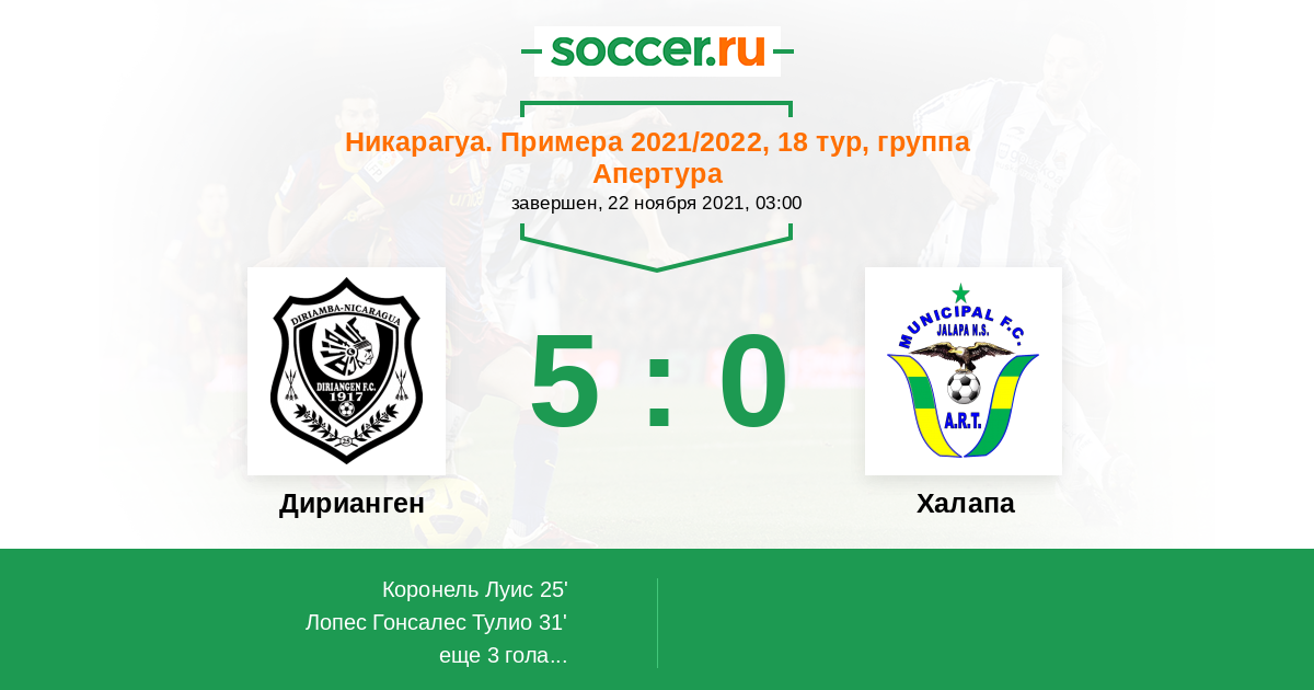 Никарагуа. Примера 27.09.2021 Халапа Логотип футбольный клуб Халапа (Окоталь) 2:1 Логотип футбольный клуб Дирианген (Дириамба) Дирианген