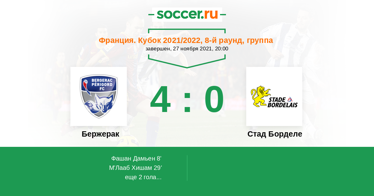 Франция. Кубок 27.11.2021 Бержерак Логотип футбольный клуб Бержерак 4:0 Логотип футбольный клуб Стад Борделе (Ле-Бускат) Стад Борделе