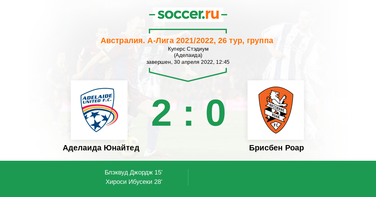 Австралия. А-Лига 01.05.2015 Аделаида Юнайтед Логотип футбольный клуб Аделаида Юнайтед 2:1 Логотип футбольный клуб Брисбен Роар Брисбен Роар