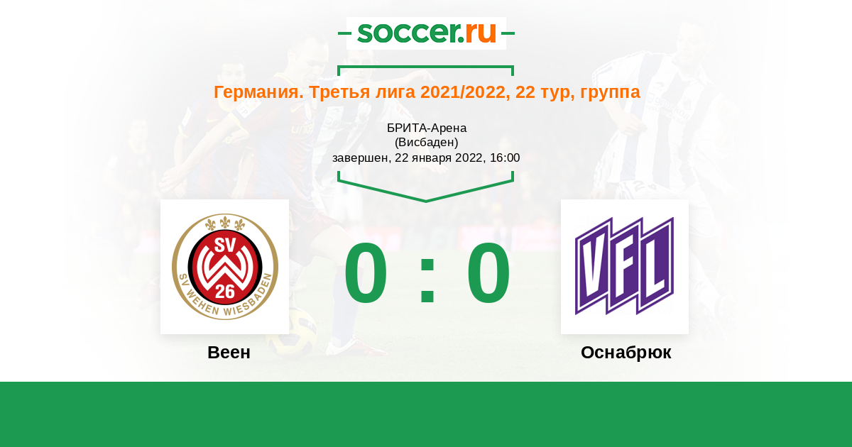 Германия. Третья лига 14.08.2021 Оснабрюк Логотип футбольный клуб Оснабрюк 0:1 Логотип футбольный клуб Веен (Висбаден) Веен
