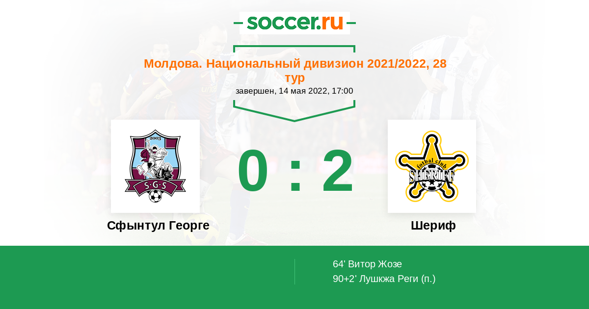 Молдова. Национальный дивизион 14.05.2023 Сфынтул Георге Логотип футбольный клуб Сфынтул Георге (Суручены) 0:2 Логотип футбольный клуб Шериф (Тирасполь) Шериф
