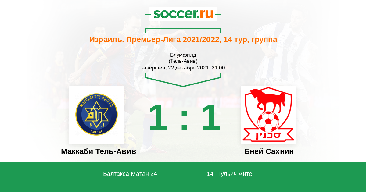 Израиль. Премьер-Лига 30.04.2022 Бней Сахнин Логотип Бней Сахнин 1:0 Логотип футбольный клуб Маккаби Тель-Авив Маккаби Тель-Авив