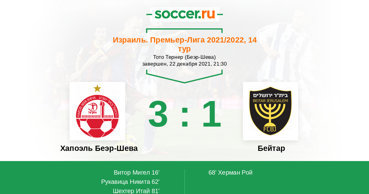 Израиль. Премьер-Лига 22.12.2014 Бейтар Логотип футбольный клуб Бейтар (Иерусалим) 0:3 Логотип футбольный клуб Хапоэль Беэр-Шева Хапоэль Беэр-Шева