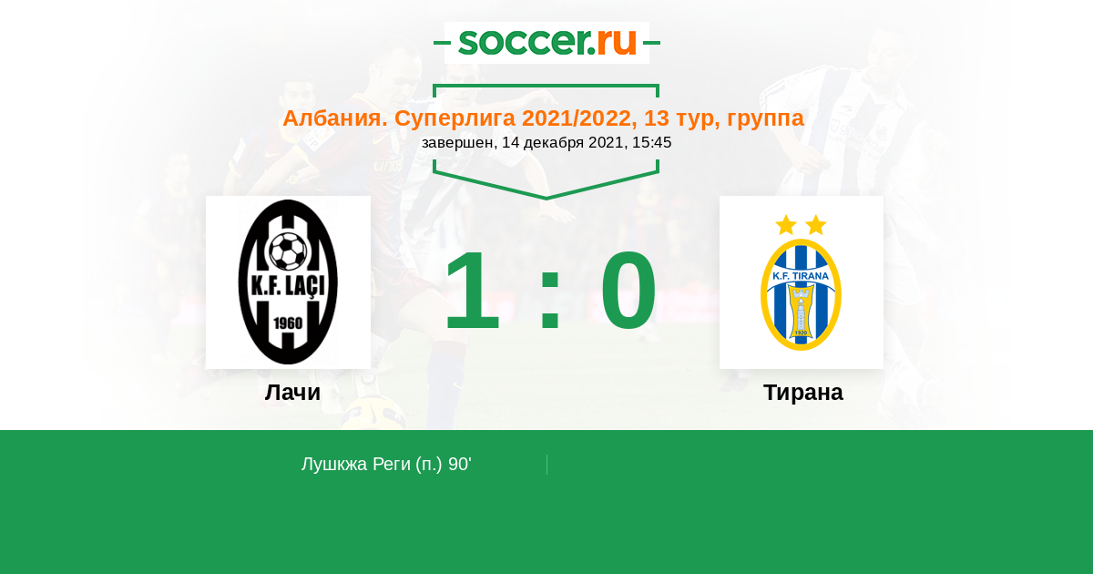 Албания. Суперлига 09.12.2020 Лачи Логотип футбольный клуб Лачи 0:1 Логотип футбольный клуб Тирана Тирана