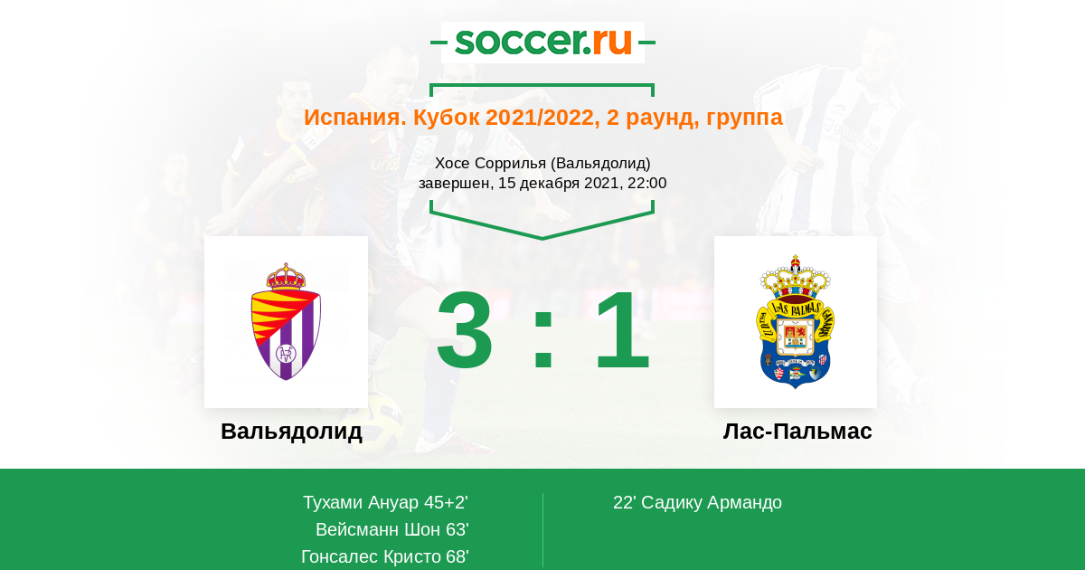 Испания. Сегунда 23.11.2014 Вальядолид Логотип футбольный клуб Вальядолид 1:2 Логотип футбольный клуб Лас-Пальмас Лас-Пальмас