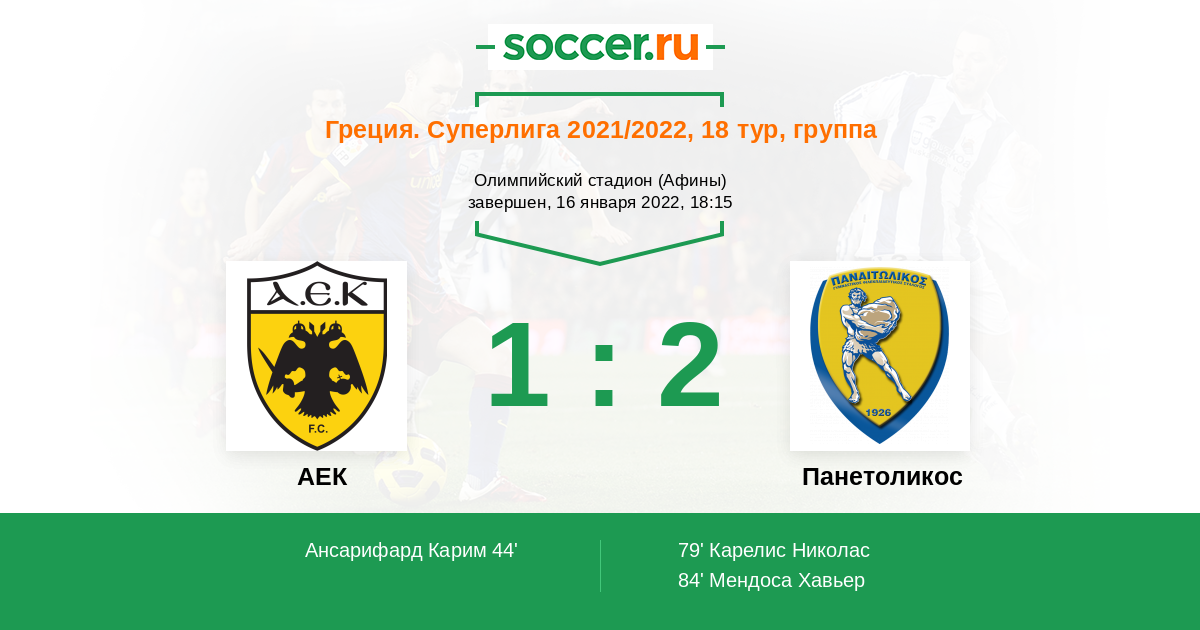 Греция. Суперлига 15.01.2023 АЕК Логотип футбольный клуб АЕК (Афины) 4:1 Логотип футбольный клуб Панетоликос (Агринио) Панетоликос