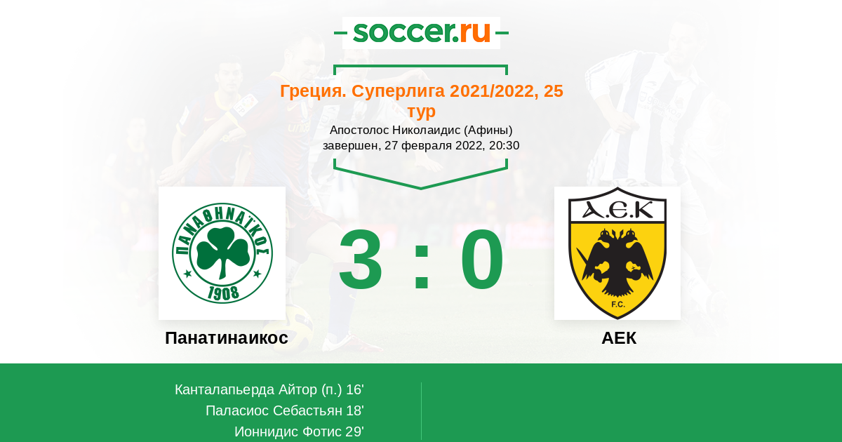 Греция. Суперлига 28.02.2021 Панатинаикос Логотип футбольный клуб Панатинаикос (Афины) 1:1 Логотип футбольный клуб АЕК (Афины) АЕК