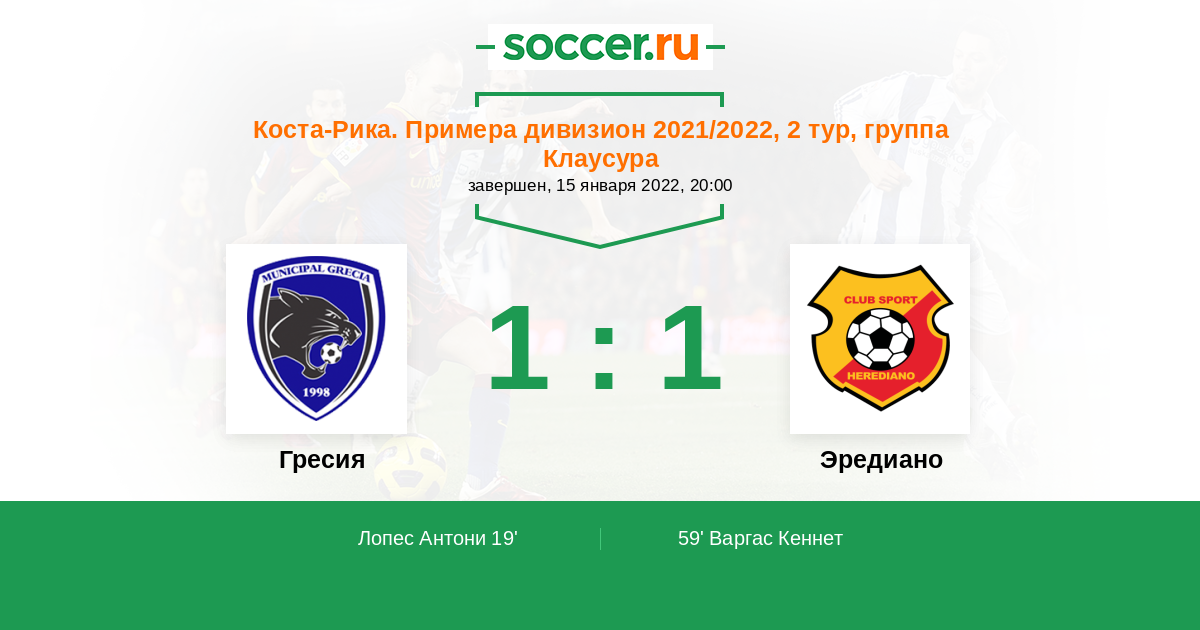 Коста-Рика. Примера дивизион 21.01.2021 Эредиано Логотип футбольный клуб Эредиано 1:1 Логотип футбольный клуб Гресия Гресия