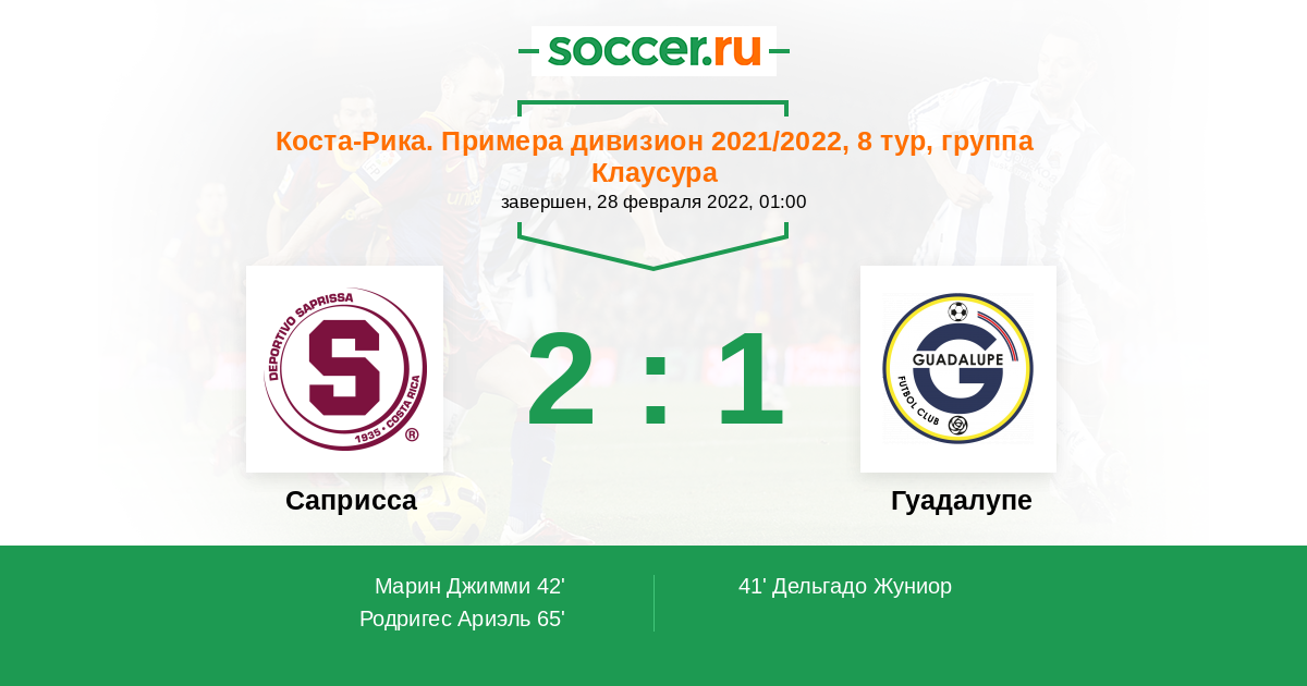 Коста-Рика. Примера дивизион 06.03.2020 Гуадалупе Логотип футбольный клуб Гуадалупе 2:1 Логотип футбольный клуб Саприсса (Сан Хосе) Саприсса
