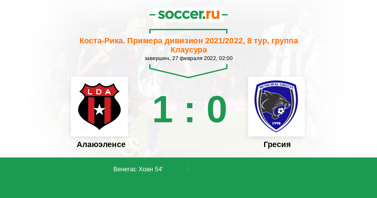 Коста-Рика. Примера дивизион 05.02.2020 Алаюэленсе Логотип футбольный клуб Алаюэленсе (Алаюэла) 5:1 Логотип футбольный клуб Гресия Гресия