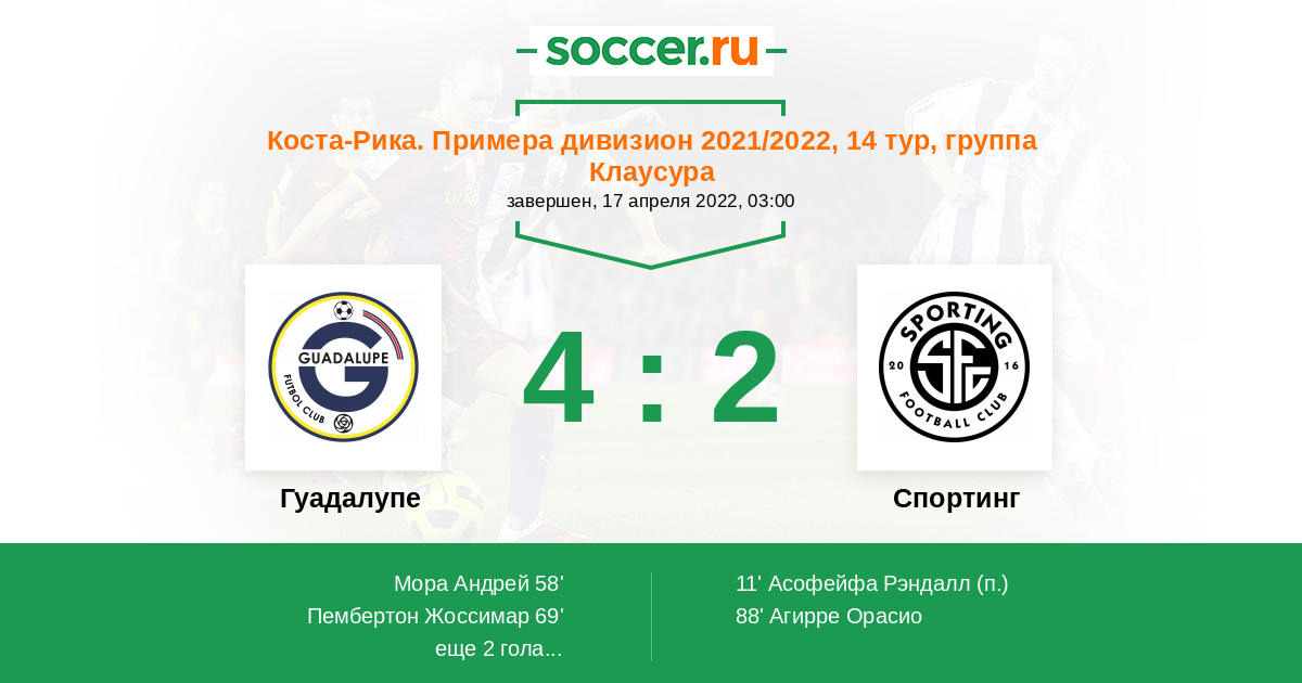 Коста-Рика. Примера дивизион 22.08.2022 Спортинг Сан-Хосе Логотип футбольный клуб Спортинг Сан-Хосе 4:2 Логотип футбольный клуб Гуадалупе Гуадалупе