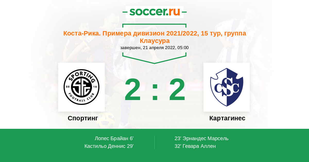 Коста-Рика. Примера дивизион 04.02.2022 Картахинес Логотип футбольный клуб Картахинес (Карфаген) 2:1 Логотип футбольный клуб Спортинг Сан-Хосе Спортинг Сан-Хосе