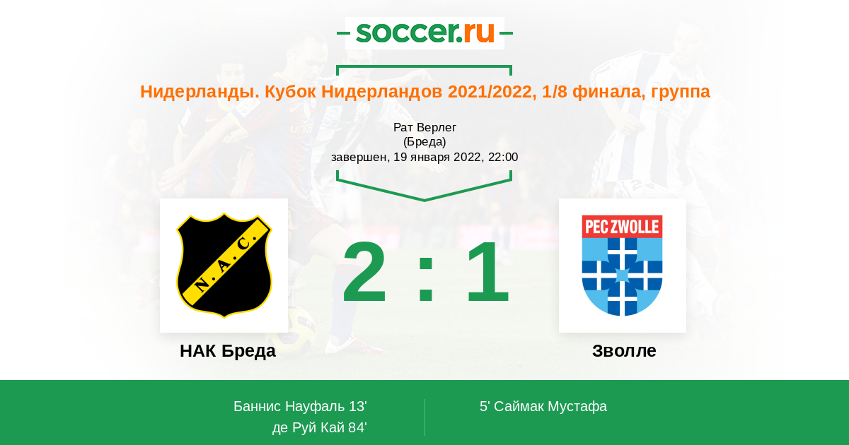 Нидерланды. Эредивизи 17.01.2015 Зволле Логотип футбольный клуб Зволле 4:1 Логотип футбольный клуб НАК Бреда НАК Бреда