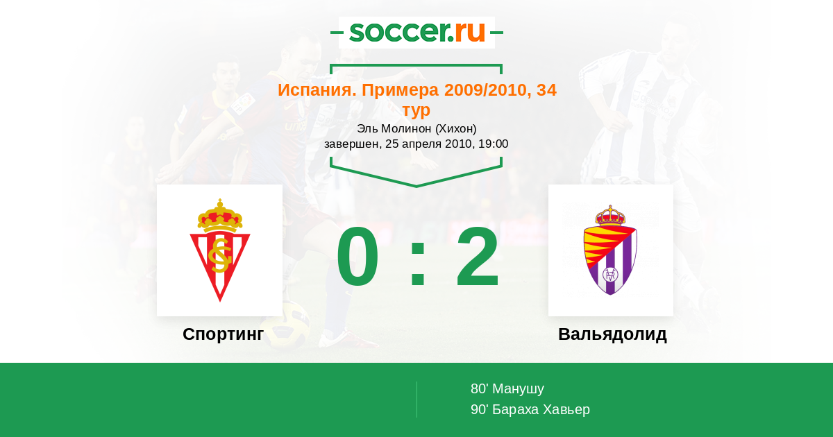 Испания. Примера 23.05.2009 Вальядолид Логотип футбольный клуб Вальядолид 1:2 Логотип футбольный клуб Спортинг (Хихон) Спортинг