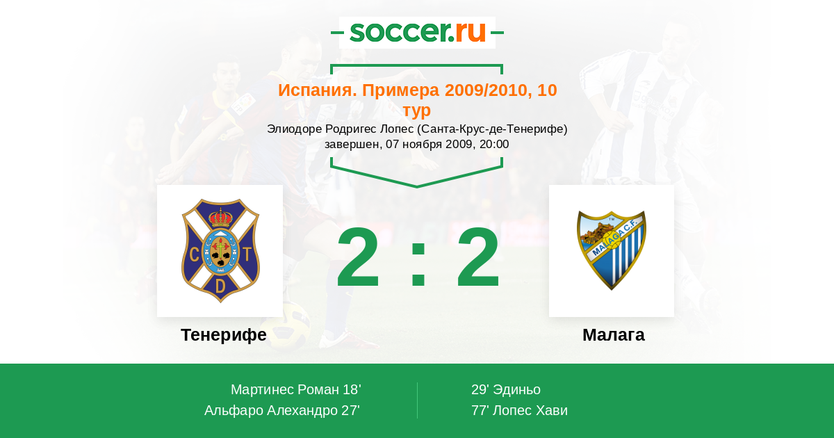 Испания. Примера 27.03.2010 Малага Логотип футбольный клуб Малага 1:1 Логотип футбольный клуб Тенерифе (Санта-Крус-де-Тенерифе) Тенерифе