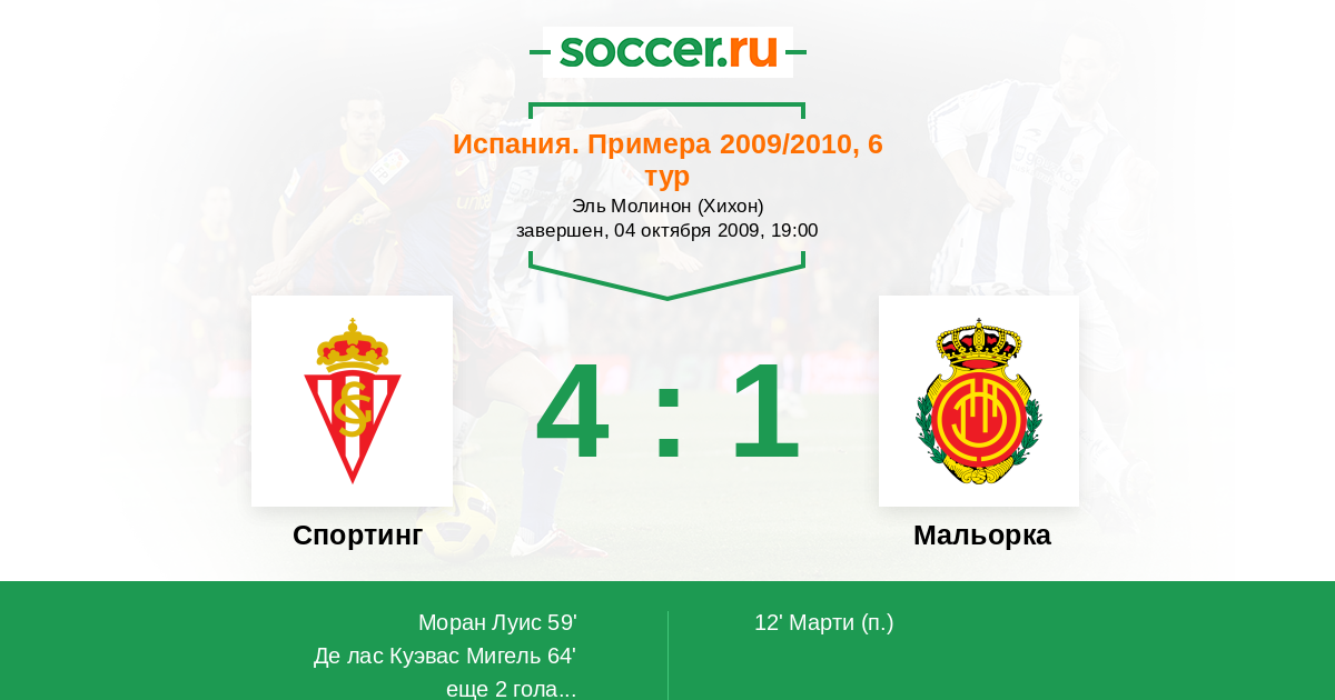 Испания. Примера 04.10.2009 Спортинг Логотип футбольный клуб Спортинг (Хихон) 4:1 Логотип футбольный клуб Мальорка (Пальма-де-Мальорка) Мальорка