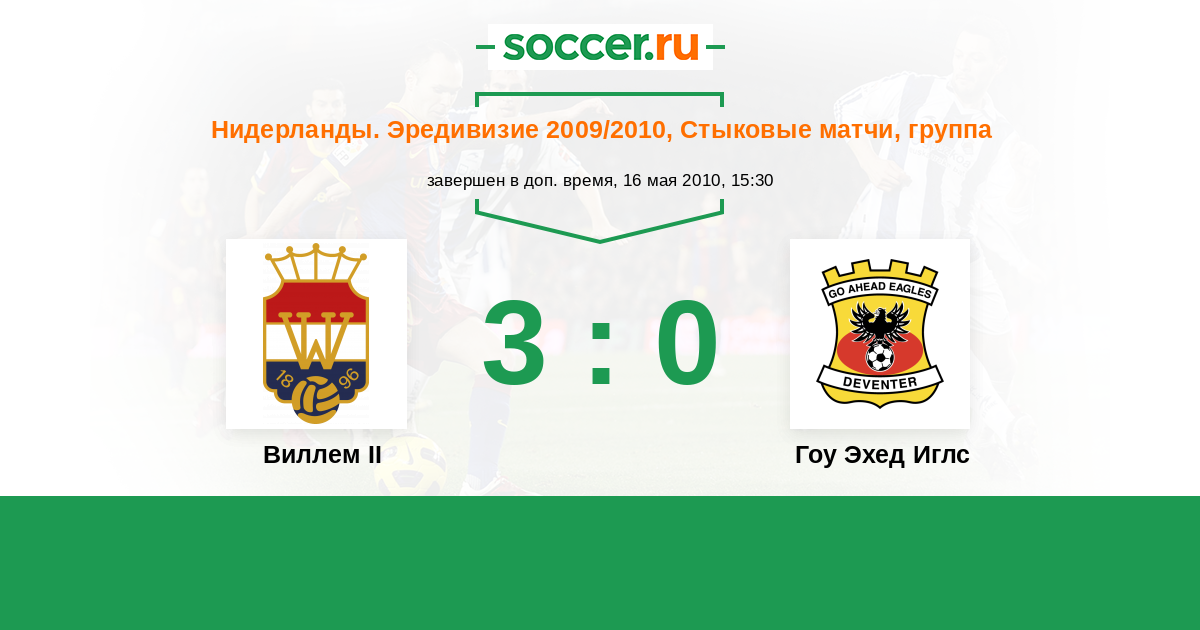 Нидерланды. Эредивизи 13.05.2010 Гоу Эхед Иглс Логотип футбольный клуб Гоу Эхед Иглс (Девентер) 1:0 Логотип футбольный клуб Виллем II (Тилбург) Виллем II