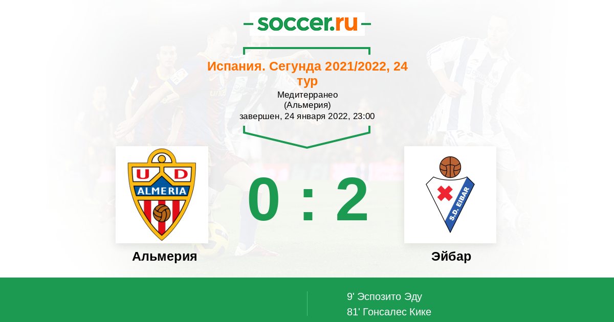 Встречаются две команды из лидирующей группы. У Альмерии дела идут чуть получше, чем у Эйбара, команда больше забивает и меньше пропускает. Фактор своего поля позволяет причислить Альмерию к фаворитам этого матча.