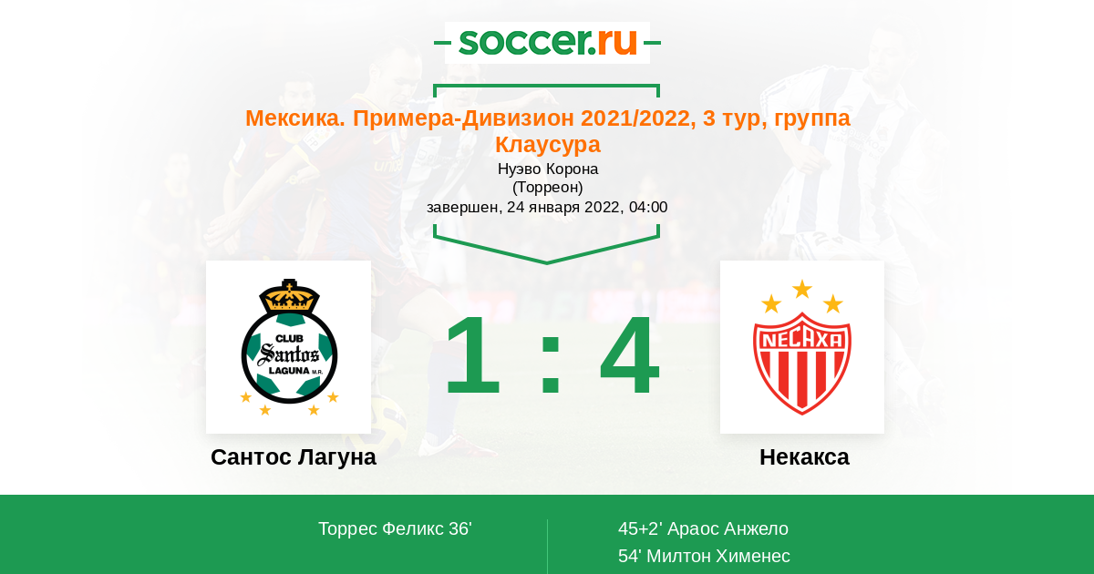 Мексика. Примера-Дивизион 24.07.2021 Некакса Логотип футбольный клуб Некакса (Агуаскальентес) 0:3 Логотип футбольный клуб Сантос Лагуна (Торреон) Сантос Лагуна
