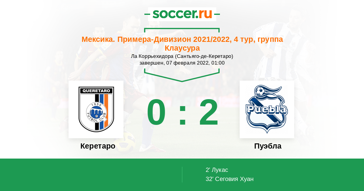 Мексика. Примера-Дивизион 22.02.2021 Керетаро Логотип футбольный клуб Керетаро (Сантьяго-де-Керетаро) 1:1 Логотип футбольный клуб Пуэбла (Пуэбла-де-Сарагоса) Пуэбла