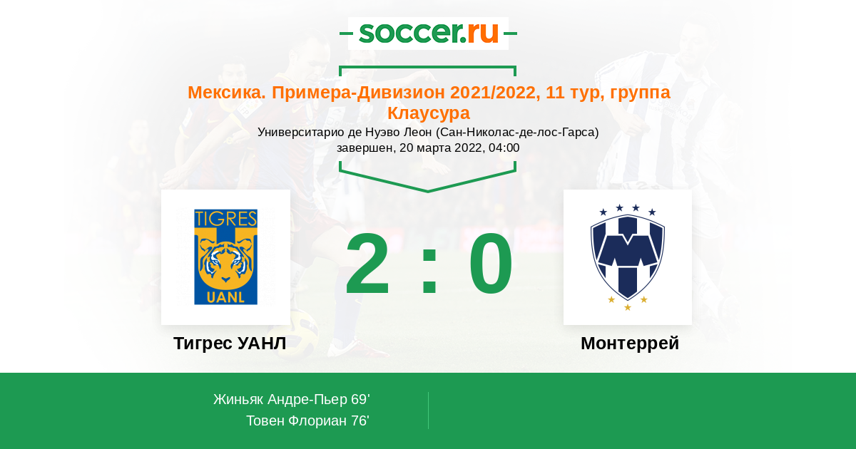 Мексика. Примера-Дивизион 19.03.2023 Тигрес УАНЛ Логотип футбольный клуб Тигрес УАНЛ (Монтеррей) 0:1 Логотип футбольный клуб Монтеррей Монтеррей