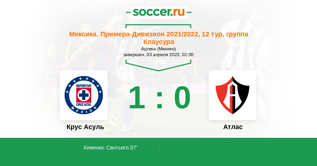 Мексика. Примера-Дивизион 21.03.2021 Крус Асуль Логотип футбольный клуб Крус Асуль (Мехико) 3:2 Логотип футбольный клуб Атлас (Гвадалахара) Атлас